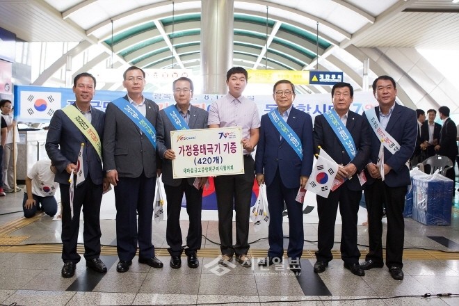 경북 구미시가 광복 70년을 맞아 지난 12일 구미역에서 개최한 ‘나라사랑 태극기 달기 운동’ 캠페인에 참여한 새마을금고중앙회 구미시협의회가 420개의 태극기를 기증하고 기념촬영을 하고 있다.(사진제공=구미시청)
