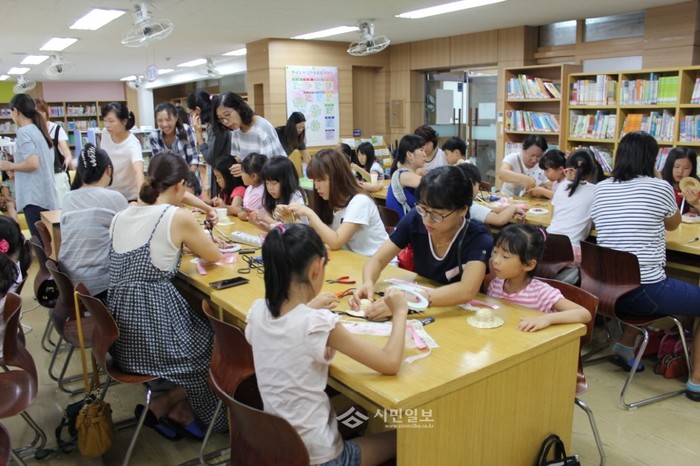 경북 구미시 옥계초등학교가 최근 옥빛 옥계 학부모회 주관의 '방향제 만들기' 프로그램을 본교 도서관에서 실시한 가운데 참여 학부모와 자녀들이 함께 방향제를 만들고 있다.(사진제공=구미교육지원청)