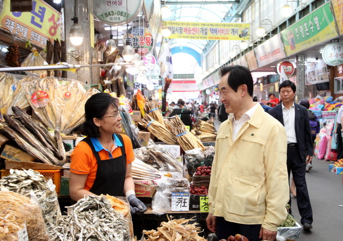 안병용 경기 의정부시장(오른쪽)이 최근 지역 전통시장 및 상점가 활성화를 위한 계획의 일환으로 의정부제일시장을 방문해 물건을 구입하기 전 상인의 의견을 청취하고 있다.(사진제공=의정부시청)