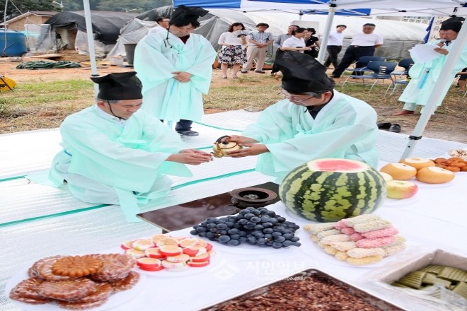 인천 남동구 도림동이 최근 마을의 당나무 앞에서 제례를 올리고 마을의 액운을 쫓아 지역 주민의 화합과 번영을 기원하는 '엄나무 당제'를 개최한 가운데 제관들이 상에 올릴 술을 따르고 있다.(사지제공=남동구청)