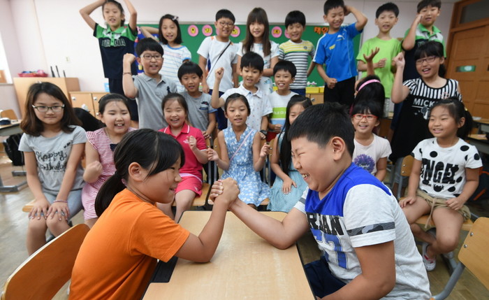 최근 전국 대부분 학교가 여름방학을 마치고 개학을 한 가운데 경기도 수원시 화양초등학교 3학년 학생들이 팔씨름을 하며 힘 겨루기를 하고 있다. /뉴시스
