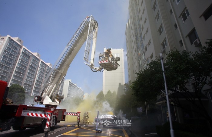 지난 17일 오후 2시 서울 강남구가 대치동 우성아파트에서 화재시 초동조치 강화로 주민들 스스로 생명과 재산보호를 위해 실시한 ‘아파트 화재 안전 대피 훈련’에서 소방 구조차가 화재 모의상황 아래 주민을 구조하고 있다.(사진제공=강남구청)