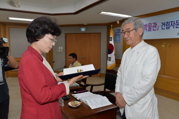 최근 서울 송파구청 기획상황실에서 열린 ‘송파 책박물관’ 건립자문위원 위촉식에 참석한 박춘희 구청장(왼쪽)이 건립자문위원 위촉장을 수여하고 있다.(사진제공=송파구청)