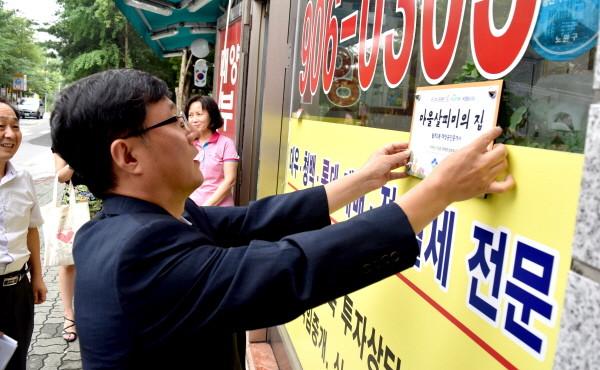 노원구는 지난 20일 오후 3시부터 월계2동주민센터 인근 상가내 업소 4곳을 방문해 '마을살피미 자원봉사자 현판 및 명패 전달식'을 연 가운데 김성환 구청장이 태양부동산을 방문해 마을살피미 자원봉사자 현판을 달고 있다.(사진제공=노원구청)