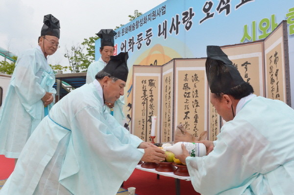 경기 동두천문화원은 지난 20일 칠석을 맞이해 견우와 직녀의 설화를 모티브로 한 '제1회 어화둥둥 내사랑 오작교 문화제'를 개최했다. 사진은 이날 행사에 참여한 오세창 시장(왼쪽)이 풍년을 기원하는 칠성제례를 지내고 있는 모습.(사진제공=동두천시청)