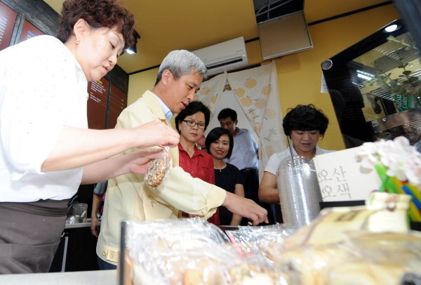 경기 오산시가 최근 오색시장 고객지원센터에서 오색시장 문화관광형 육성사업을 위한 사업단 사무실 개소식을 개최한 가운데 곽상욱 시장(왼쪽에서 두 번째)이 사업단의 주요 사업 중 하나인 '행가로 카페 2호점'을 찾아 쿠키를 고르고 있다.(사진제공=오산시청)