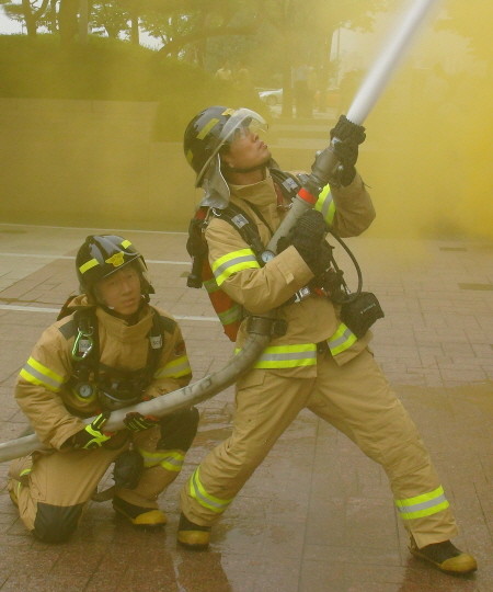 최근 서울 영등포소방서가 '제339차 민방위의 날'을 맞아 여의도에 위치한 LG트윈타워 빌딩에서 적 공습 등에 따른 화재 등 재난상황 발생 상황을 가정한 민·관합동 소방훈련을 실시했다. 사진은 소방호스를 사용해 화재를 진압 중인 소방관의 모습. (사진제공=영등포소방서)