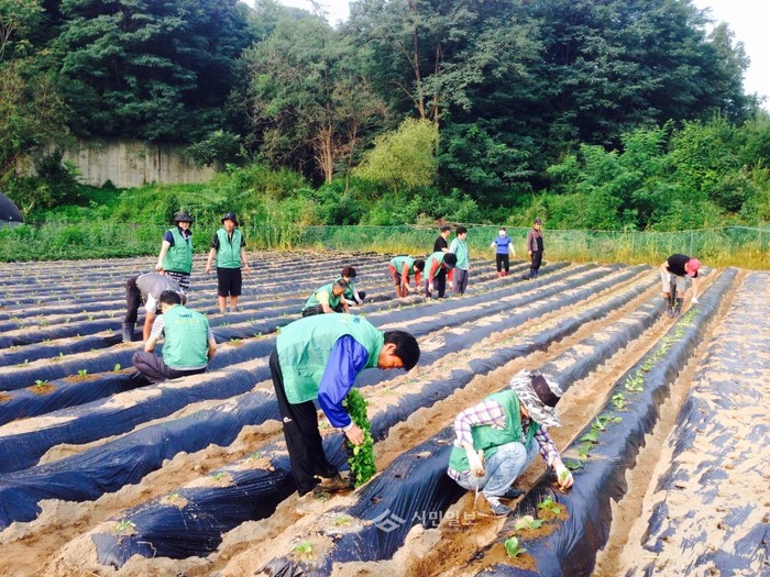 경기 이천시 관고동 새마을협의회는 24일 시음동에서 배추심기 행사를 진행했다. 사진은 김장철 어려운 이웃을 위한 사랑의 김장나누기 행사에 사용될 배추를 심고 있는 참여자들의 모습.(사진제공=이천시청)