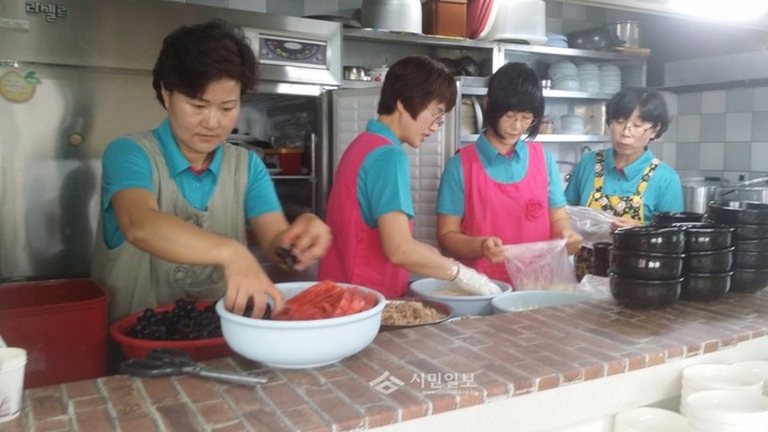 최근 서초구 방배1동에서 행복한교회(서초대로 26길19)의 후원으로 지역내 120명의 노인들과 함께 실시한 ‘어르신 건강기원 경로잔치’에 참가한 지역주민들이 분주하게 음식을 준비하고 있다.(사진제공=서초구청)