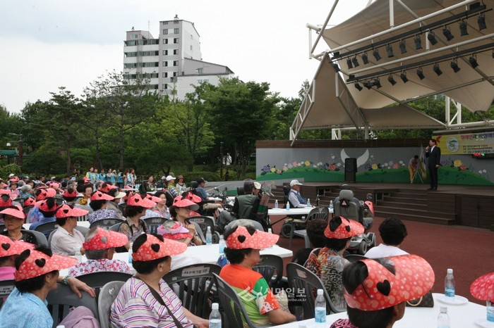 지난 24일 서울 강동구 천호공원에서 지역내 장애인·홀몸노인 등 300명과 함께한 ‘장애인과 비장애인 함께 즐기는 좋은날 행사’에 참석한 이해식 구청장(오른쪽)이 인사말을 하고 있다.(사진제공=강동구청)
