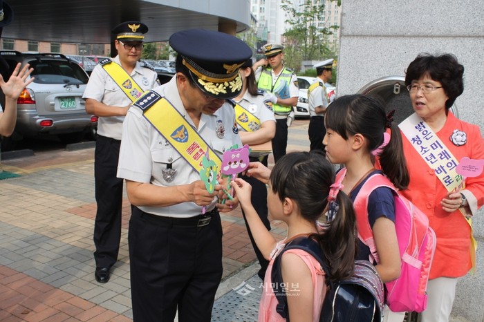 경기 김포경찰서는 지난 24일 가현초등학교에서 교육장·학교장·어머니폴리스 등 100여명이 참여한 가운데 '학교폭력 근절캠페인'을 실시했다. 사진은 이날 참여 경찰관이 학생들에게 손부채를 나눠주며 학교폭력 근절에 관한 홍보를 하고 있는 모습.(사진제공=김포경찰서)