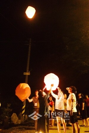 도봉구 방학3동 마을공동체 모임 '희망꾸밈단'이 최근 '2015년 서울시 마을인연맺기' 사업의 일환으로 전북 진안군 무거마을을 찾은 가운데 두 마을간 인연이 오래가기를 기원하는 마음을 담아 풍등을 띄우고 있다. (사진제공=도봉구청)