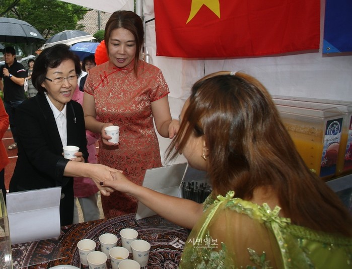 지난 25일 서울 강남구 경기여자고등학교에서 열린 '다문화축제'에 방문한 신연희 구청장(왼쪽)이 한 부스를 방문해 축제를 진행 중인 다문화가정 여성을 격려하고 있다.(사진제공=강남구청)