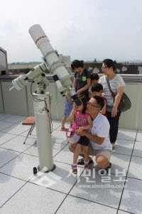 전라남도과학교육원이 최근 어린이들의 여름방학을 맞아 '해설사와 함께하는 토요체험프로그램'을 운영한 가운데 과학교육원을 찾은 가족들이 천문관측 체험을 하고 있다.(사진제공=전남교육청)