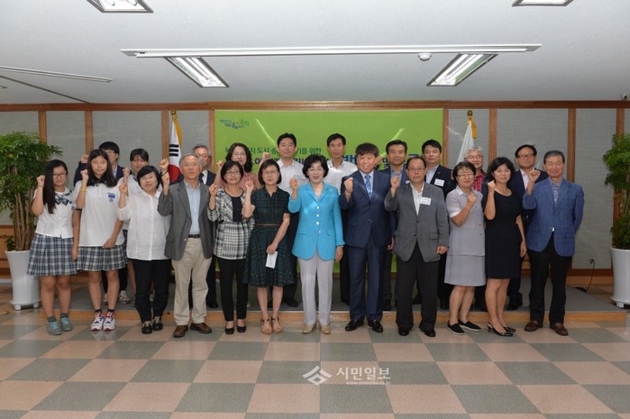 박춘희 서울 송파구청장(앞줄 왼쪽에서 일곱번째)이 지난 25일 구청 대회의실에서 열린 ‘녹색도시송파만들기’ 구민토론회에 참석해 주민들과 클린송파에 대한 토론을 마친 뒤 기념촬영을 하고 있다.(사진제공=송파구청)