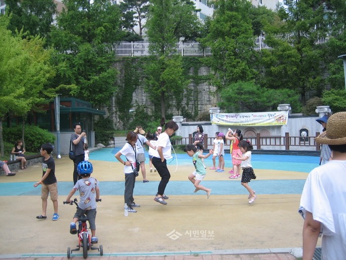 경기 용인시 수지구 상현2동은 최근 주민자치위원회 주관으로 주민센터 청사 앞 상현공원에서 '불어라 놀이바람과 함께하는 아나바다'를 개최했다. 사진은 행사에 참여한 어린이와 어른들이 함께 고무줄 놀이를 하고 있는 모습.(사진제공=용인시청)