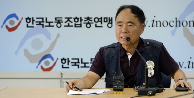 26일 오전 서울 영등포구 여의도 한국노총에서 강훈중 한국노총 대변인이 58차 중앙집행위원회 회의 결과를 발표 하고 있다.