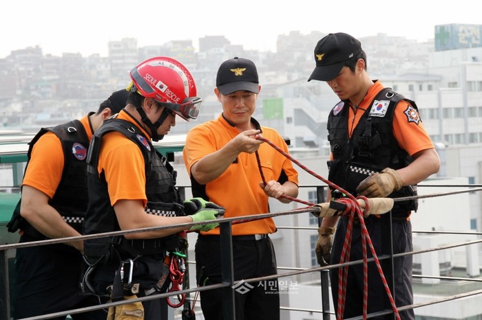 서울 용산소방서가 지난 26일 오후 지역내 고층건물에서 고층건물 인명구조시 신속한 구조활동을 위한 로프매듭 숙달훈련을 실시해 참여 소방대원들이 건물 옥상에서 로프를 난간에 묶고 있다.(사진제공=용산소방서)