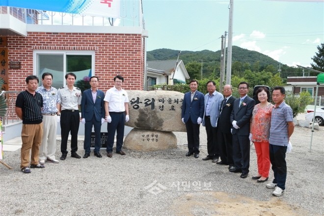 충남 아산시 도고면 석당리 경로당이 지난 26일 개관식을 가진 가운데 복기왕 시장(왼쪽에서 다섯 번째)과 주민들이 참석해 경로당 앞 마당에서 함께 기념촬영 하고 있다.(사진제공=아산시청)