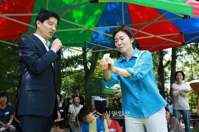 최근 경기 광주시 도척면 성분도복지관에서 서울 강동구 지역내 47개 복지관종사자들과 함께한 ‘제1회 강동복지네트워크단 워크숍’에 참석한 이해식 구청장(왼쪽)이 한 직원이 펼쳐보인 쪽지를 읽고 있다.(사진제공=강동구청)