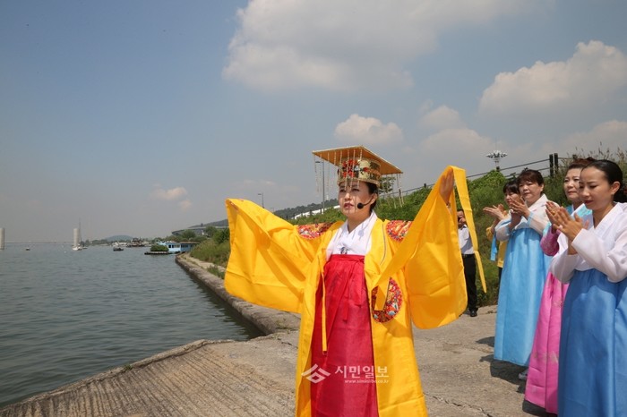 마포구 망원동 성산대교 아래 한강시민공원 망원지구에서 '제25회 마포나루굿 재현행사'가 최근 열린 가운데 무속인들이 '마포나루굿' 행사의 하나로 물의 신령인 용신을 부르는 의식을 하고 있다.(사진제공=마포구청)