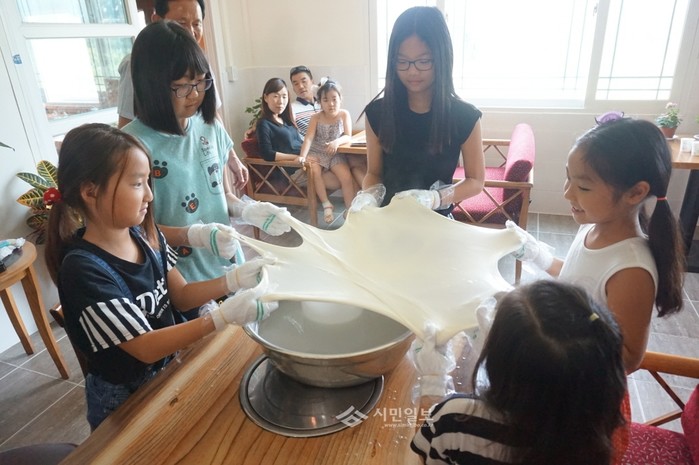 경기 포천시립가산도서관은 최근 영중면 거사리 하네뜨치즈 체험농장을 찾아 치즈를 만들고 시식해 보는 '꿈다락 토요문화학교' 현장체험학습을 실시했다. 사진은 체험학습에 참여한 어린이들이 치즈를 늘이고 있는 모습.(사진제공=포천시청)