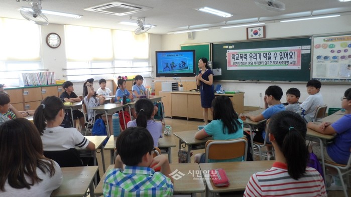 경기 부천시 성곡초등학교가 최근 폭력없는 안전하고 즐거운 학교환경을 정착시키기 위해 5학년 학생들을 대상으로 '학교폭력 우리가 막을 수 있어요!'라는 제목의 '학교폭력 예방 프로그램'을 진행했다. 사진은 프로그램에 참여한 학생들이 '청소년 상담복지센터' 전문상담사들의 교육을 듣고 있는 모습.(사진제공=부천교육지원청)