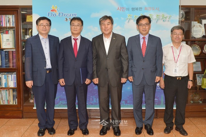 경기 동두천시가 법제 환경 변화에 능동적으로 대처하기 위해 이임성 변호사(오른쪽에서 두 번째), 이춘산 변호사(왼쪽에서 두 번째)를 지난 31일 고문변호사로 위촉하며 오세창 시장(가운데)과 변호사 및 시 관계자들이 기념촬영을 하고 있다.(사진제공=동두천시청)