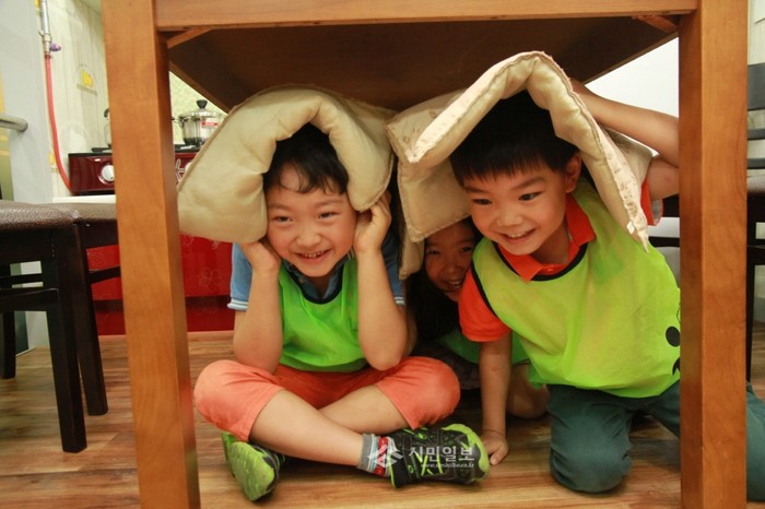 서울 구로소방서는 최근 도담도담어린이집 원생 및 지도교사 등을 본서 3층에 마련된 소방안전체험교실로 초청해 '나는야 용감한 소방대장' 체험학습 프로그램을 운영했다. 사진은 프로그램에 참여한 어린이들이 지진 대피 체험을 진행 중인 모습.(사진제공=구로소방서)
