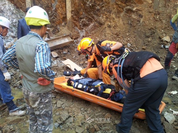경기 오산소방서 소방대원들이 지난 30일 오전 화성시 동탄면 영처리 소재 건물 터파기 공사현장에서 발생한 추락사고 현장에 출동해 환자를 구조하고 있다.(사진제공=오산소방서)
