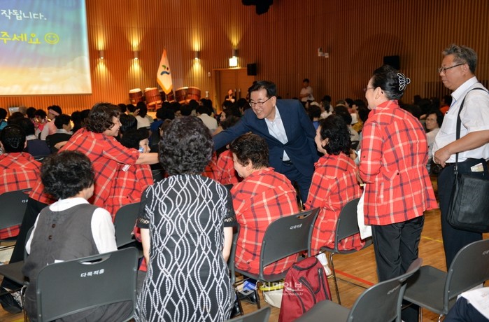 지난 1일 서울시청에서 진행된 성인문해 교육기관들이 모여 시낭송과 공연을 펼치는 ‘(사)푸른사람들 청춘문화제’ 행사에 참석한 유덕열 동대문구청장이 동대문구 참가팀을 격려하고 있다.(사진제공=동대문구청)