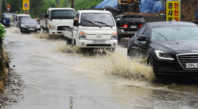 기습적인 폭우가 내린 2일 오후 경기도 광주시 초월읍 선동교차로 인근에서 차량들이 물보라를 일으키며 서행하고 있다.