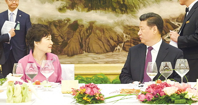 박근혜 대통령과 시진핑(習近平) 중국 국가주석이 2일 오후 중국 베이징 인민대회당 서대청에서 오찬을 하며 대화하고 있다.