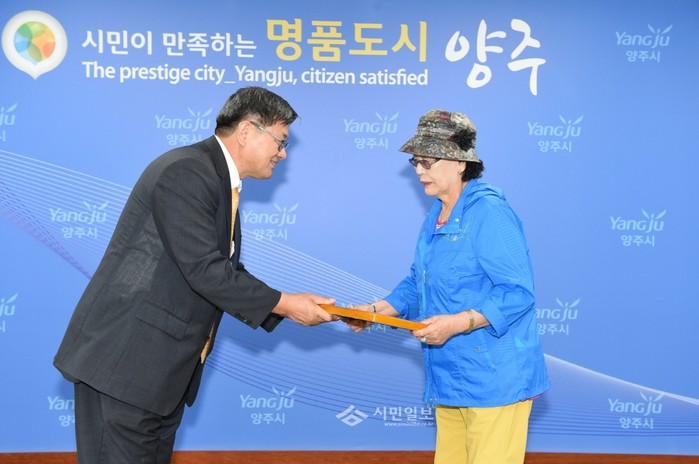 경기 양주시장 권한대행 김건중 부시장은 3일 시청 대회의실에서 열린 월례조회에 참석해 각 분야에서 성과를 거둔 일반인과 공무원에게 표창을 전달했다. 사진은 김 부시장이 유공자 가족에게 '6.25 참전 국가유공자 공로패'를 전달하는 모습.(사진제공=양주시청)