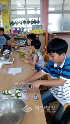 전남 나주북초등학교는 최근 학부모와 학생들이 함께하는 '꿈자람 여름계절학교'를 운영한 가운데 참여 학생이 직접 호박을 자르며 '음식 만들기 체험'을 하고 있는 모습.(사진제공=전남교육청)