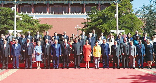 박근혜 대통령과 시진핑 중국 국가주석 내외, 각국 정상들이 ‘항일전쟁 및 세계 반파시스트 전쟁 승리 70주년 기념행사’가 열린 3일 오전 중국 베이징 자금성에서 기념촬영을 하고 있다. 이날 열병식에는 헬리콥터 Z-8, 대륙간탄도미사일(ICBM) ‘둥펑(DF, 東風)-31A’등 중국 최신예 무기를 선보였다. /뉴시스