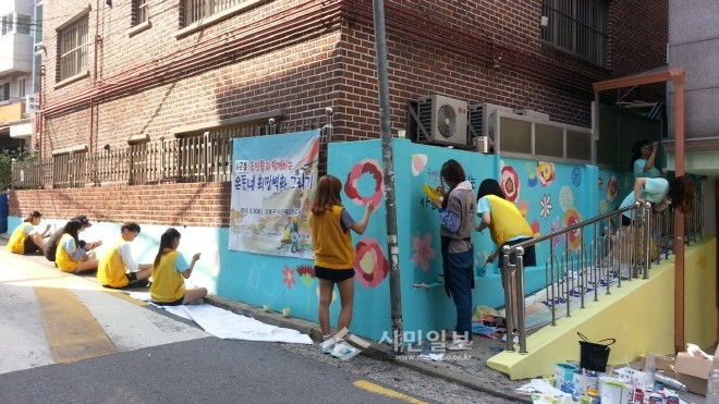 서울 성동구는 최근 사근제3경로당 입구 담벼락에 ‘사근동 주민들과 함께하는 온 동네 희망벽화 만들기’ 봉사 프로젝트를 실시한 가운데 자원봉사자들이 사근제3경로당의 낡은 담벼락에 예쁜 꽃 벽화를 그리고 있다.(사진제공=성동구청)