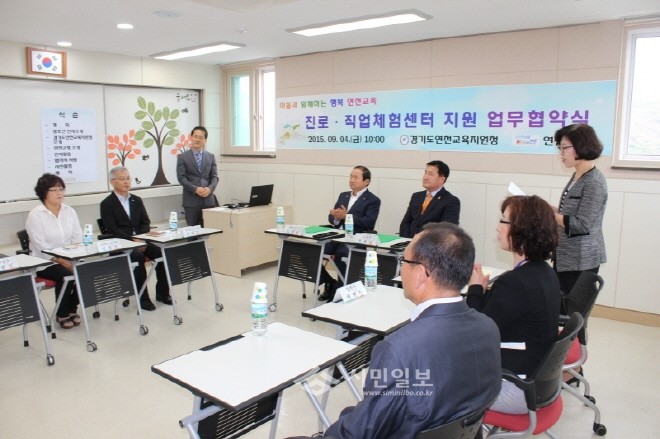 경기 연천교육지원청은 지난 4일 연천교육지원청 소회의실에서 연천군청과 업무협약을 맺고 자유학기제 실시에 따른 청소년 진로교육과 진로체험활동 활성화 지원을 위한 '진로직업체험지원센터' 운영에 협력하기로 했다. 사진은 이날 협약식에 참석한 양측 관계자들의 모습.(사진제공=연천교육지원청)