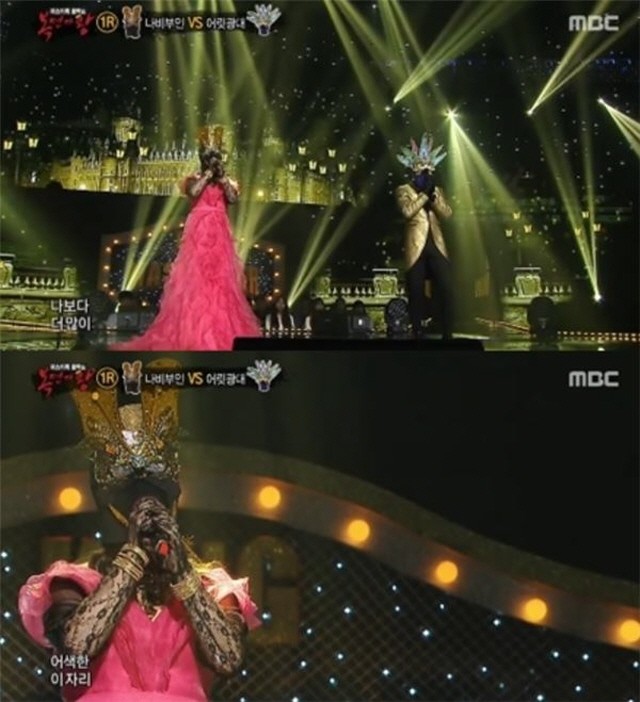 이날 방송에서 첫 번째 도전자로 등장한 나비부인과 어릿광대는 정태우 장나라의 'Be Happy'를 열창했다.