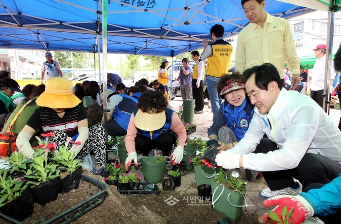 경기 의정부시 신곡1동주민센터는 제26회 경기도 생활대축전의 성공적인 개최를 위해 지난 5일 지역내 주요 도로변 꽃길 가꾸기 행사를 진행했다. 사진은 이날 행사에 참여한 안병용 시장(오른쪽)이 주민들과 함께 꽃을 심고 있는 모습.(사진제공=의정부시청)