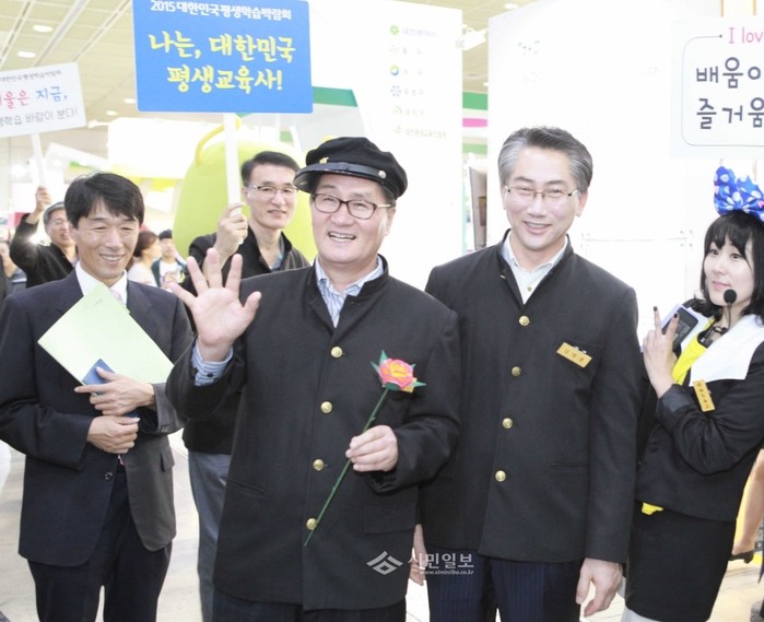 유종필 서울 관악구청장(왼쪽)이 최근 코엑스 컨퍼런스룸에서 열린 '2015 전국평생학습도시협의회 제2차 총회'에 참석한 가운데 개막식 행사가 끝난 후 옛날 교복을 입고 전시장을 관람하고 있다. (사진제공=관악구청)