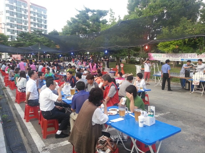 경북 구미시 형곡1동은 최근 동주민센터 앞 주차장에서 장학기금 및 불우이웃돕기성금 마련을 위한 호프바자회를 개최한 가운데 바자회를 찾은 지역주민들이 시원한 맥주를 마시며 담소를 나누고 있다.(사진제공=구미시청)
