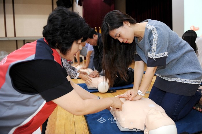 지난 7일 오전 송파구청 대강당에서 전직원을 대상으로 실시된 '안전도시송파 심폐소생술 교육'에 참석한 직원들이 지도 강사의 지시에 따라 심폐소생술 실습을 하고 있다.(사진제공=송파구청)
