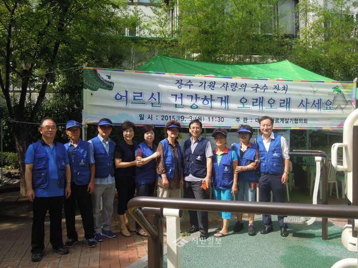 서울 은평구 대조동 주민센터와 바르게살기협의회는 최근 주민센터 옆 공원에서 지역내 저소득 노인들을 대상으로 '장수기원 국수잔치' 행사를 진행한 가운데 주민센터와 협의회 관계자들이 기념사진을 찍고 있다.(사진제공=은평구청)