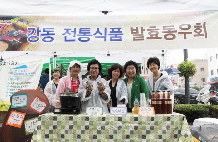 최근 서울 강동구청앞 분수광장에서 개최된 도시농업축제에 전통식품 홍보를 위해 참석한 임춘희 행정복지위원장(오른쪽에서 두 번째)이 축제참가자들과 함께 기념촬영을 하고 있다.(사진제공=강동구의회)