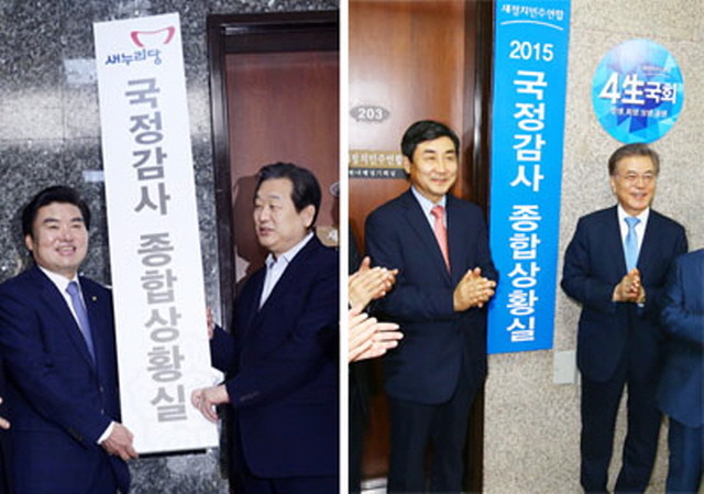 8일 오전 서울 여의도 국회에서 열린 새누리당 국정감사 종합상황실 현판식에서 김무성 대표와 원유철 원내대표가 현판을 달고있다. 이날 새정치민주연합 문재인 대표와 이종걸 원내대표를 비롯한 원내지도부들도 국회에서 열린 국정감사 종합상황실 현판식에서 박수를 치고 있다.