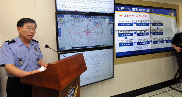 8일 오전 이평현 제주해양경비안전본부장이 제주본부 상황실에서 새정치민주연합 의원들로 구성된 '(가칭)추자도 돌고래호 전복사고 진상조사단'에게 사고와 관련한 브리핑을 하고 있다.