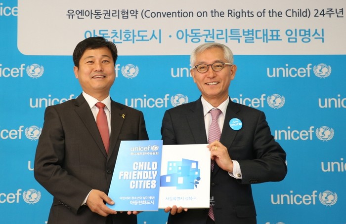 | ▲ 2013년 성북구가 유니세프 한국위원회로부터 전국최초 아동친화도시로 인증받은 가운데 인증패를 받은 김영배 성북구청장(왼쪽)의 모습. | ||