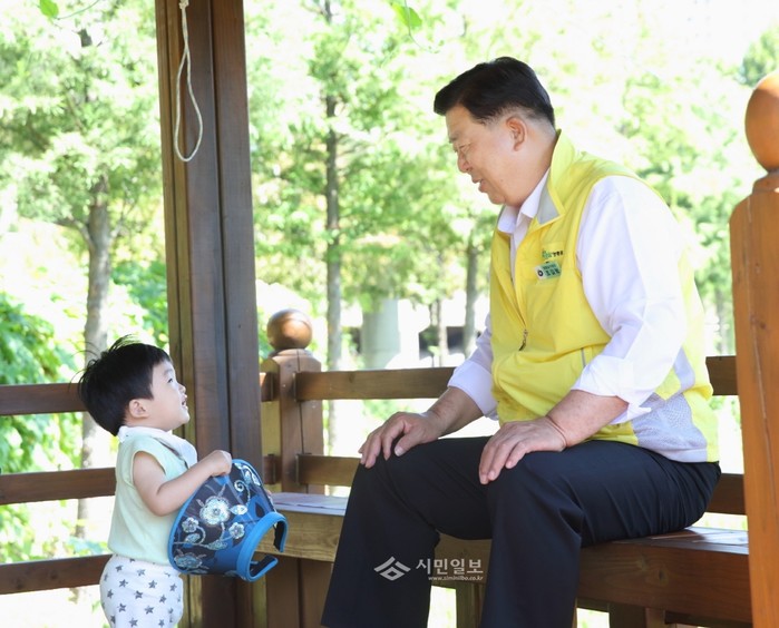 조길형 영등포구청장(오른쪽)이 지난 7일 찾아가는 현장행정의 일환으로 양평동에 위치한 '양평유수지생태공원'을 찾아 공원에 나들이를 나온 한 아이를 바라보고 있다.(사진제공=영등포구청)