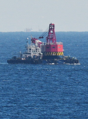 낚시어선 돌고래호(9.77t·해남 선적) 전복 사고 닷새째인 9일 오후 150t급 크레인 바지선이 제주특별자치도 제주시 추자면 청도 인근 해상에서 돌고래호 사고 선박을 인양하기 위한 준비를 하고 있다.